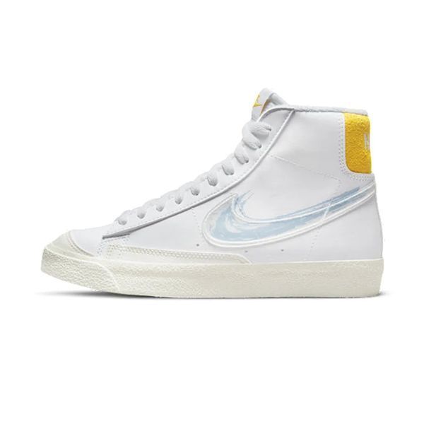 Представляємо класичні кросівки Nike Blazer Mid '77 GS у свіжому білому кольорі з ніжними блакитними акцентами на логотипі Swoosh та яскравими жовтими деталями на комірі. Модель DX3070-100 поєднує вінтажний стиль із сучасними елементами, створюючи ідеальний образ для повсякденного носіння.